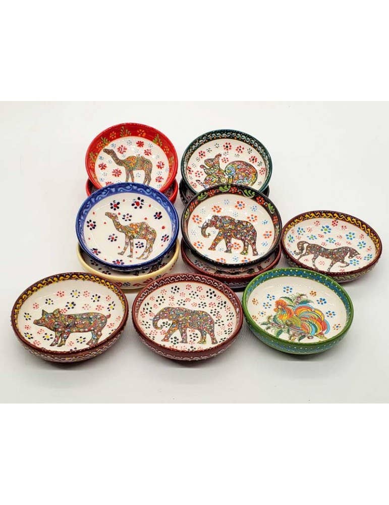 Hand-painted ceramics. Size: 4" diameter by 1 1/8" depth. The selection comes in assorted colors and animal designs. Minimum 12 Pieces. Each of them is prepared, made, and decorated with total care and dedication and by hand, minor variations in shape and size add individual style to our products.